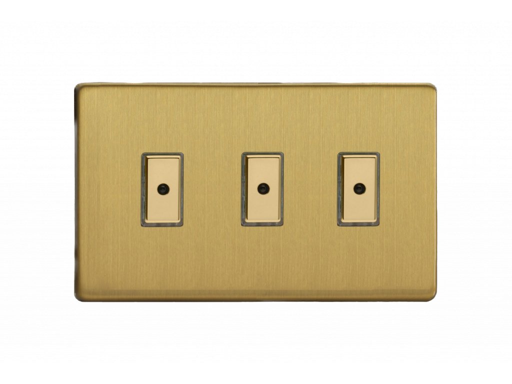 Tlačítkový vypínač IMPULSE - 3-modulový jednosměrný (č.1) 0-100 W (max 10 LEDs) 1.1A 1-pólový LED s dálkovým V-Pro BEZŠROUBKOVÉ - kartáčovaná mosaz / mosazná tlačítka