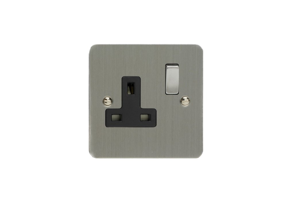 Síová zásuvka MAINS SOCKET - 1-modulový 13A 2-pólový britská zásuvka ULTRAPLOCHÉ - kartáèovaná ocel / èerná