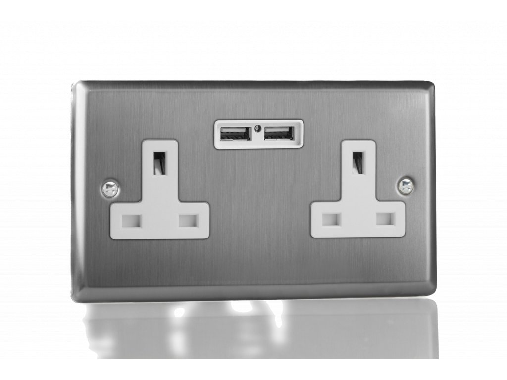 Síová zásuvka MAINS SOCKET - 2-modulový 13A britská zásuvka KLASICKÉ - kartáèovaná ocel / bílá