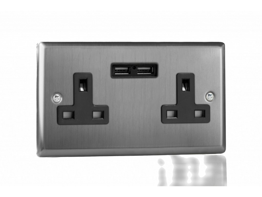 Síová zásuvka MAINS SOCKET - 2-modulový 13A britská zásuvka KLASICKÉ - kartáèovaná ocel / èerný