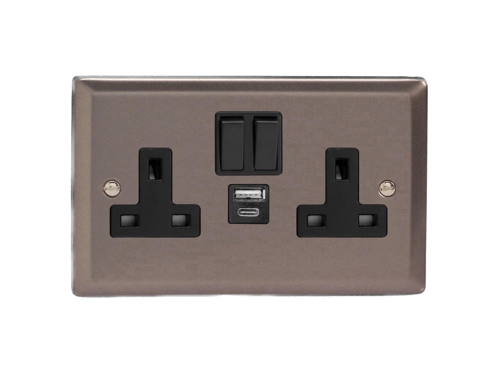 Síová zásuvka MAINS SOCKET - 2-modulový 20 W USB 13A 1-pólový britská zásuvka KLASICKÉ - cínová / èerný