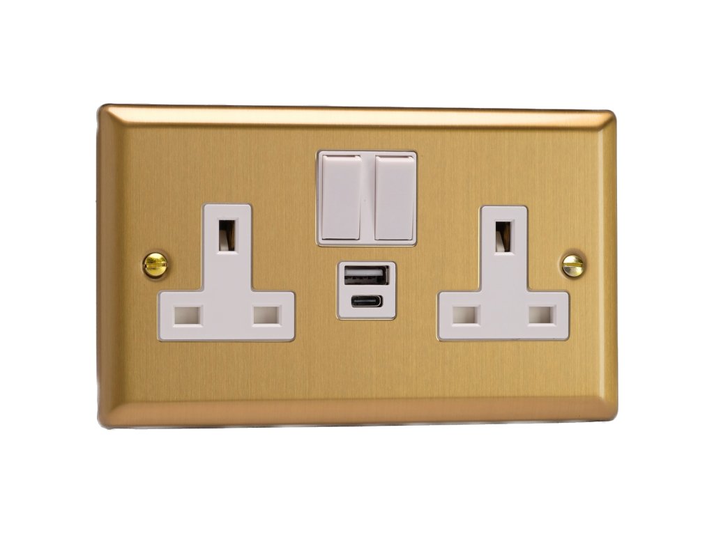 Síová zásuvka MAINS SOCKET - 2-modulový 20 W USB 13A 1-pólový britská zásuvka KLASICKÉ - kartáèovaná mosaz / bílá