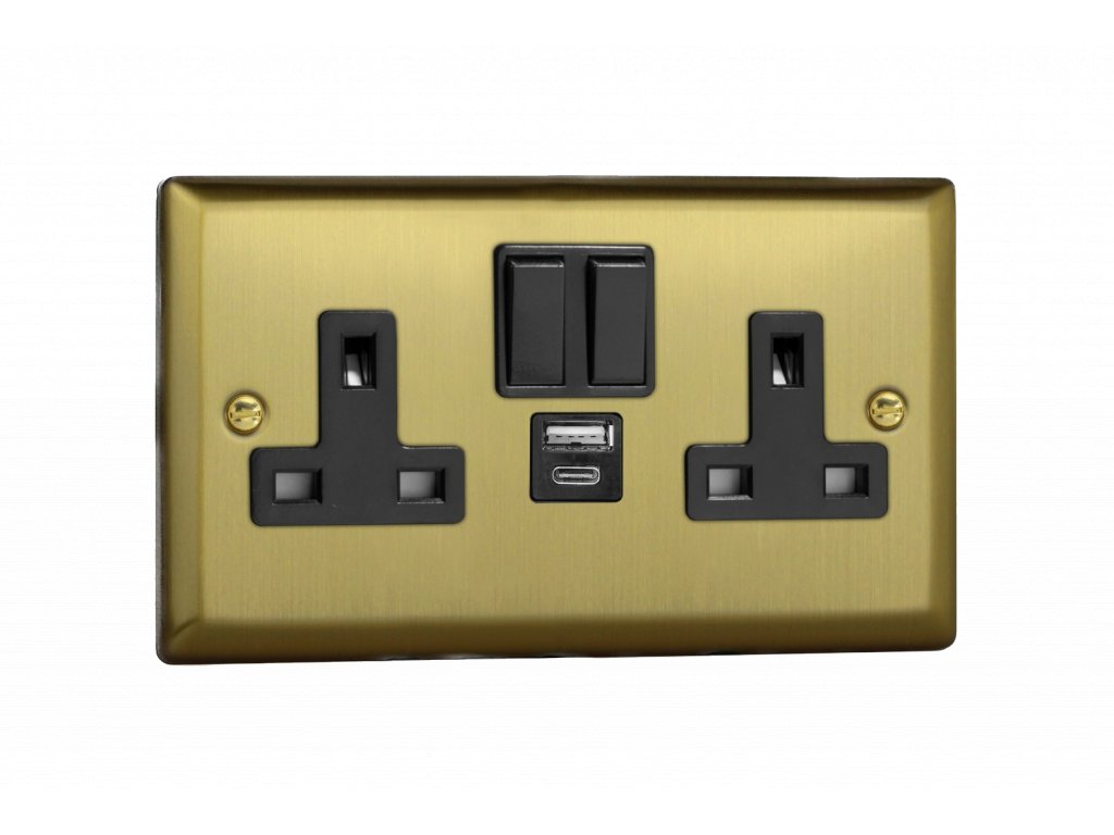 Síová zásuvka MAINS SOCKET - 2-modulový 20 W USB 13A 1-pólový britská zásuvka KLASICKÉ - kartáèovaná mosaz / èerný