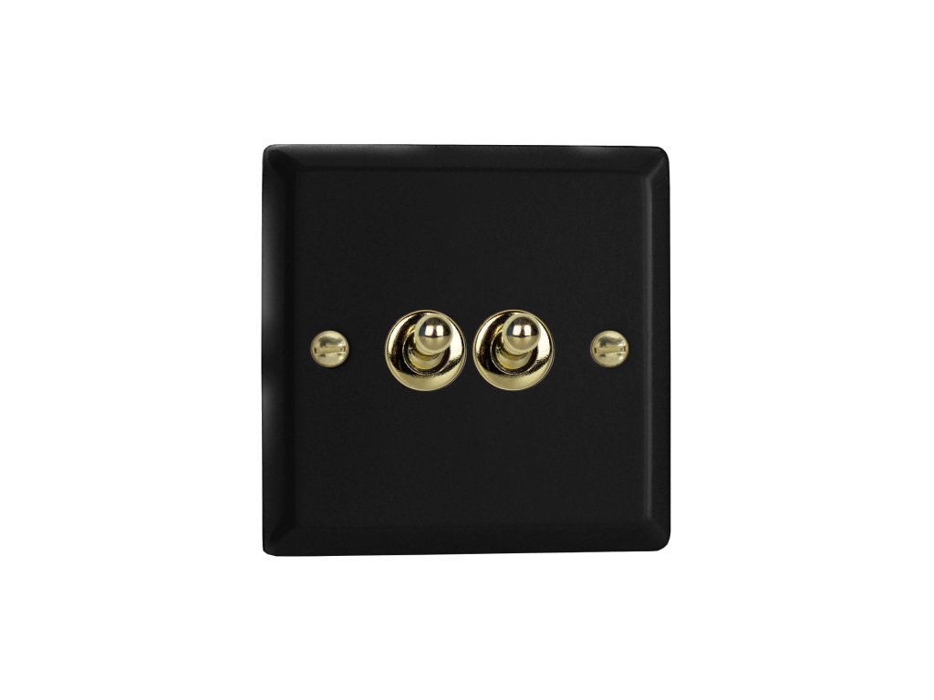 Páčkový vypínač TOGGLE - 2-modulový schodišťový (č.6); jednosměrný (č.1) 10A 1-pólový KLASICKÉ - matně černá / leštěná mosaz