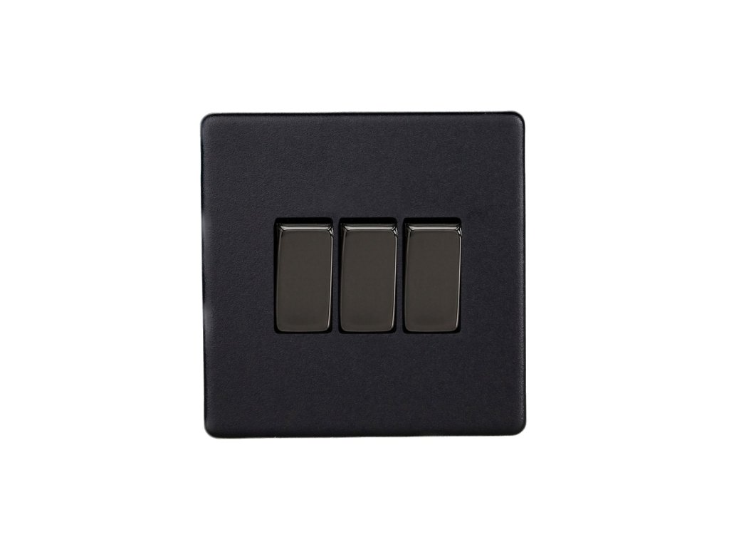 Kolébkový vypínač ROCKER - 3-modulový schodišťový (č.6); jednosměrný (č.1) 10A 1-pólový BEZŠROUBKOVÉ - matně černá / černé (lesklé) iridium