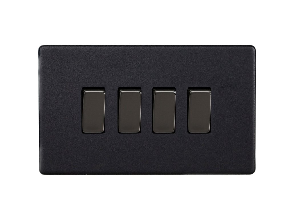 Kolébkový vypínač ROCKER - 4-modulový schodišťový (č.6); jednosměrný (č.1) 10A 1-pólový BEZŠROUBKOVÉ - matně černá / černé (lesklé) iridium