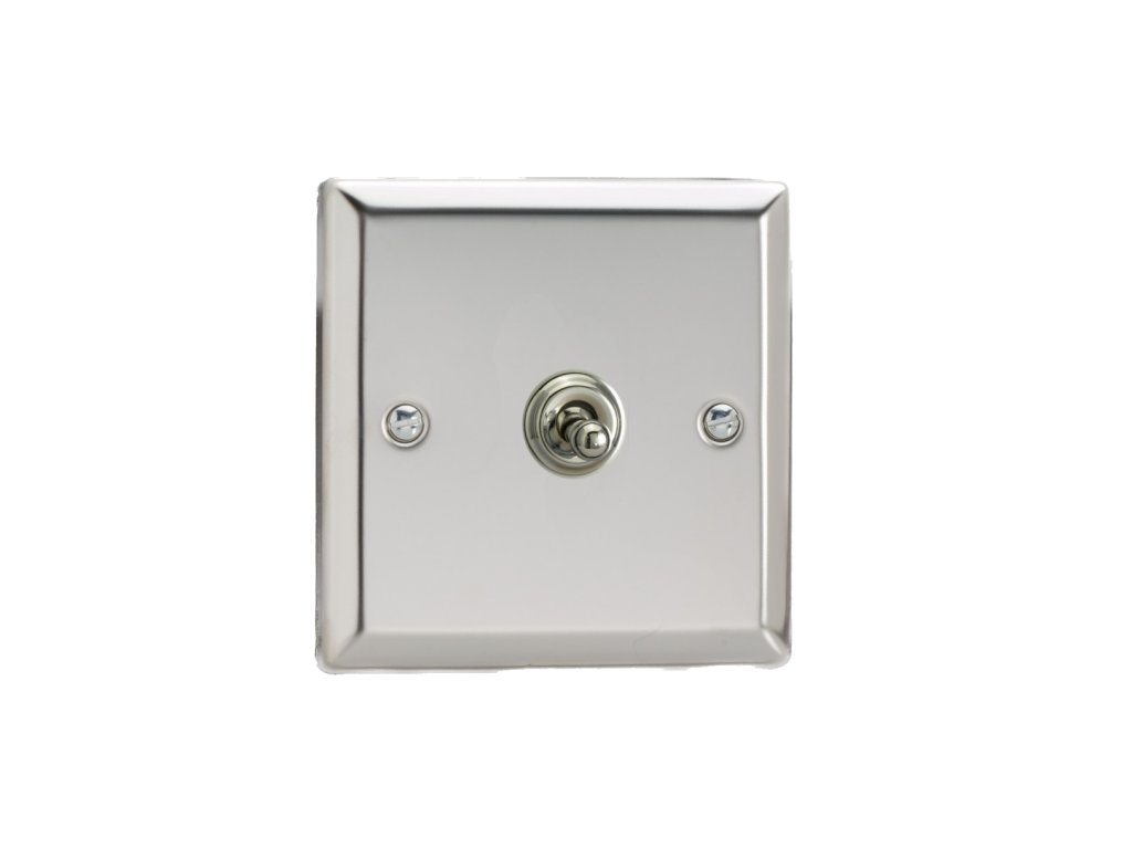 Páčkový vypínač TOGGLE - 1-modulový schodišťový (č.6); jednosměrný (č.1) 10A 1-pólový KLASICKÉ - leštěný chrom / chromová páčka