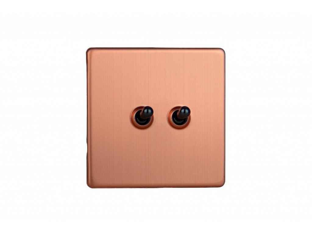 Páčkový vypínač TOGGLE - 2-modulový schodišťový (č.6); jednosměrný (č.1) 10A 1-pólový BEZŠROUBKOVÉ - kartáčovaná měď / černé (lesklé) iridium