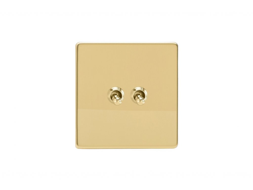 Páčkový vypínač TOGGLE - 2-modulový schodišťový (č.6); jednosměrný (č.1) 10A 1-pólový BEZŠROUBKOVÉ - leštěná mosaz / mosazné páčky
