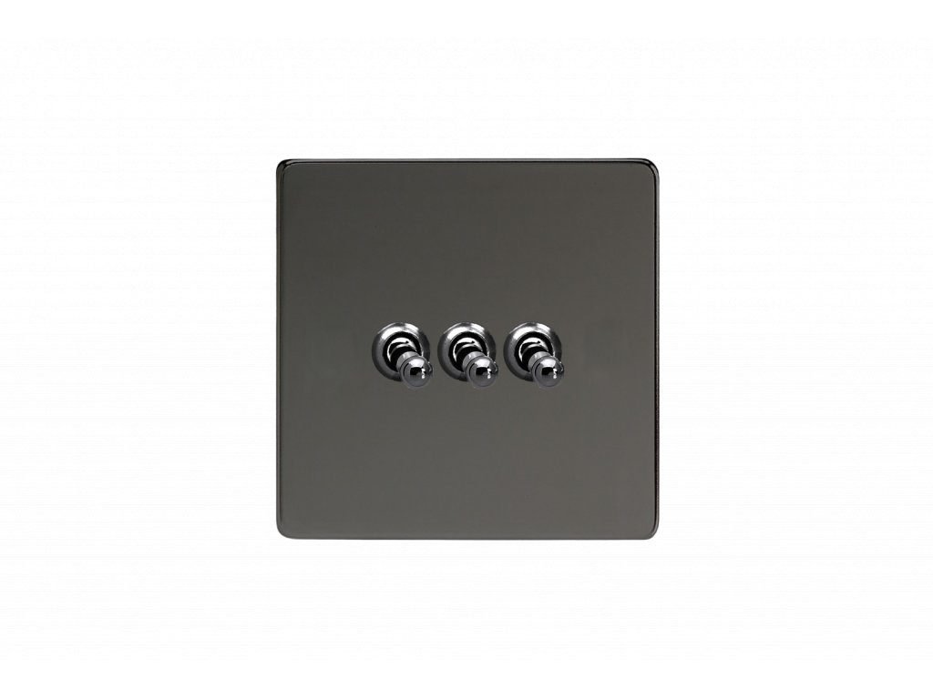 Páčkový vypínač TOGGLE - 3-modulový schodišťový (č.6); jednosměrný (č.1) 10A 1-pólový BEZŠROUBKOVÉ - černé (lesklé) iridium / černé (lesklé) iridium