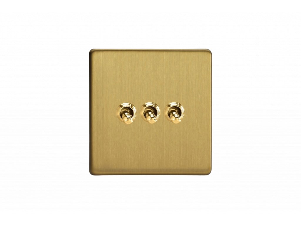 Páčkový vypínač TOGGLE - 3-modulový schodišťový (č.6); jednosměrný (č.1) 10A 1-pólový BEZŠROUBKOVÉ - kartáčovaná mosaz / mosazné páčky