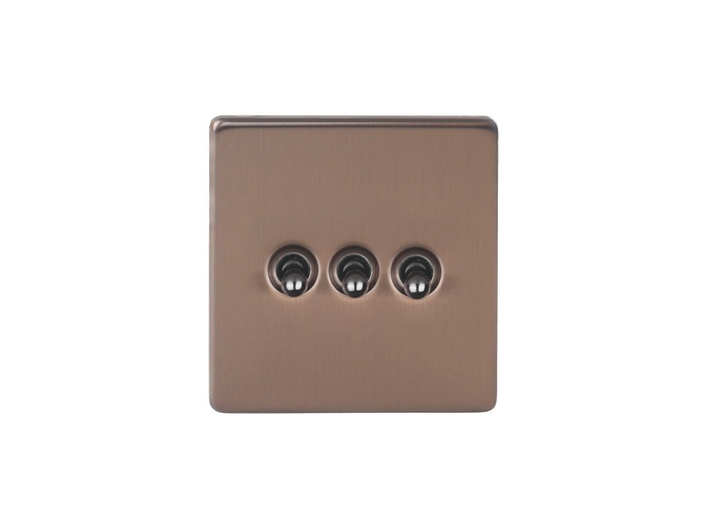 Páčkový vypínač TOGGLE - 3-modulový schodišťový (č.6); jednosměrný (č.1) 10A 1-pólový BEZŠROUBKOVÉ - kartáčovaný bronz / černé (lesklé) iridium