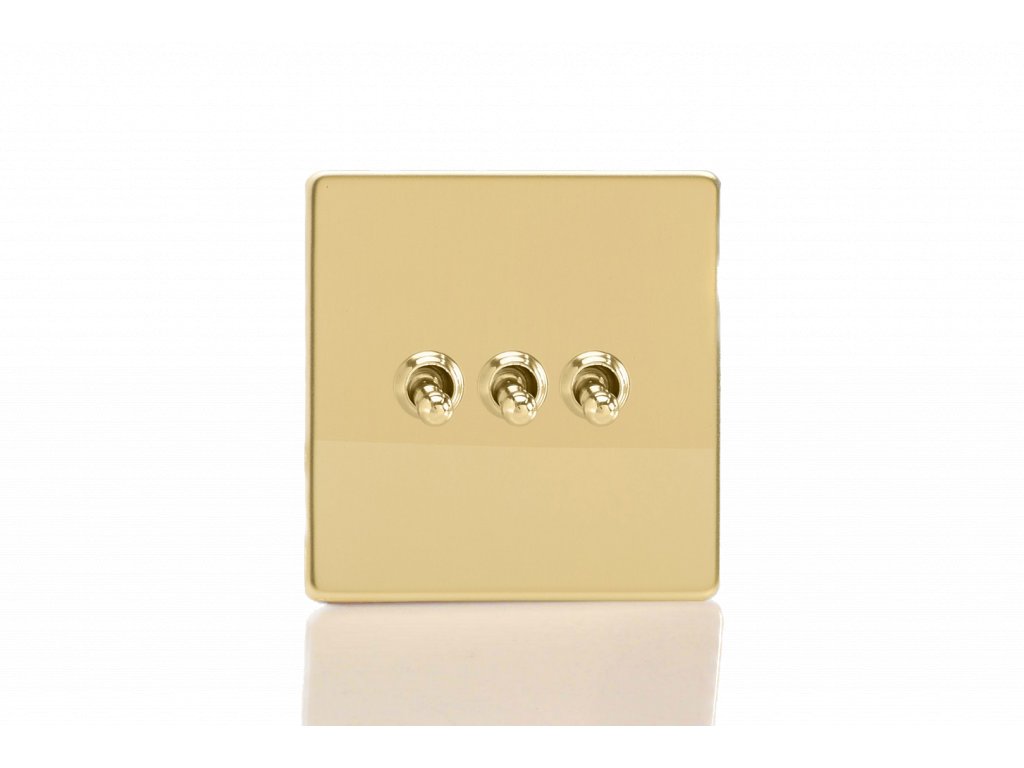 Páčkový vypínač TOGGLE - 3-modulový schodišťový (č.6); jednosměrný (č.1) 10A 1-pólový BEZŠROUBKOVÉ - leštěná mosaz / mosazné páčky