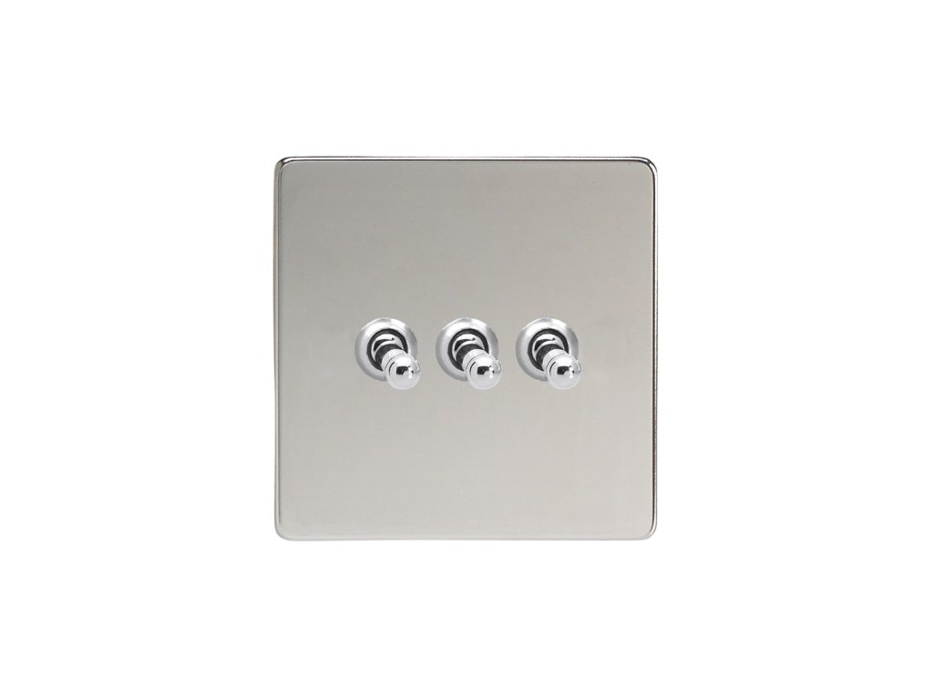Páčkový vypínač TOGGLE - 3-modulový schodišťový (č.6); jednosměrný (č.1) 10A 1-pólový BEZŠROUBKOVÉ - leštěný chrom / chromové páčky
