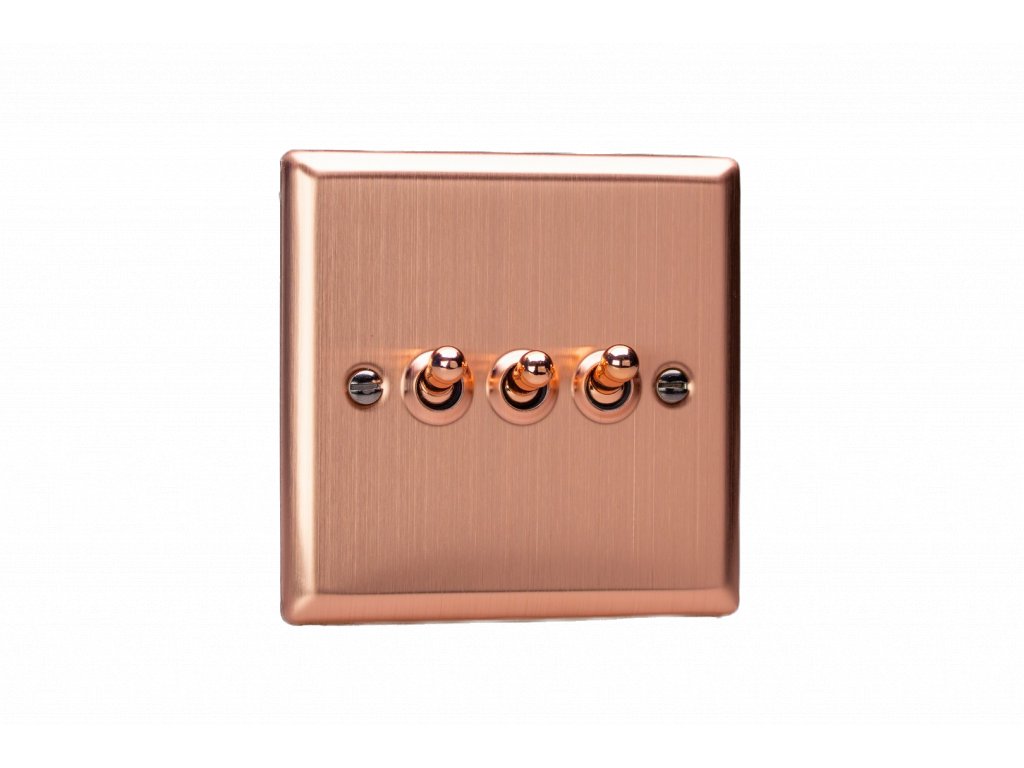 Páčkový vypínač TOGGLE - 3-modulový schodišťový (č.6); jednosměrný (č.1) 10A 1-pólový KLASICKÉ - kartáčovaná měď / měděné páčka