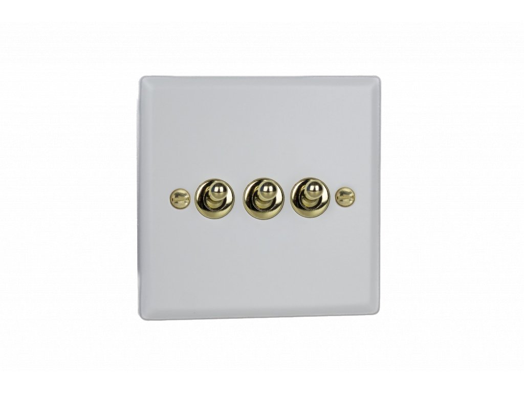 Páčkový vypínač TOGGLE - 3-modulový schodišťový (č.6); jednosměrný (č.1) 10A 1-pólový KLASICKÉ - matně bílá / leštěná mosaz