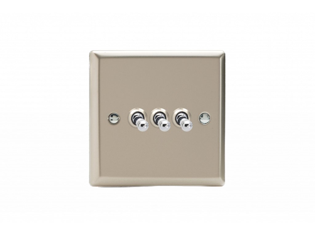 Páčkový vypínač TOGGLE - 3-modulový schodišťový (č.6); jednosměrný (č.1) 10A 1-pólový KLASICKÉ - satén / chromové páčky