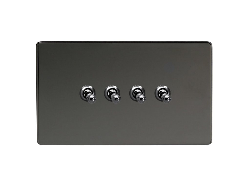 Páčkový vypínač TOGGLE - 4-modulový schodišťový (č.6); jednosměrný (č.1) 10A 1-pólový BEZŠROUBKOVÉ - černé (lesklé) iridium / černé (lesklé) iridium