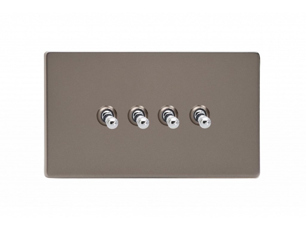 Páèkový vypínaè TOGGLE - 4-modulový schodiový (è.6); jednosmìrný (è.1) 10A 1-pólový BEZROUBKOVÉ - cínová / chromové páèky