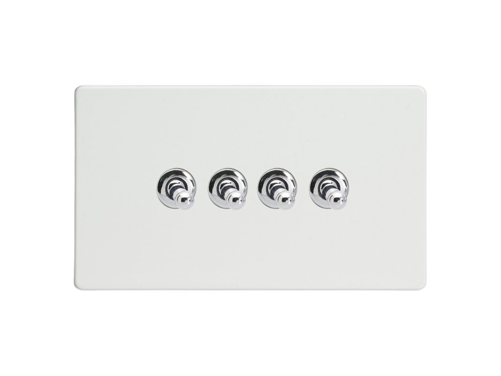 Páčkový vypínač TOGGLE - 4-modulový schodišťový (č.6); jednosměrný (č.1) 10A 1-pólový BEZŠROUBKOVÉ - prémiová bílá / chromové páčky