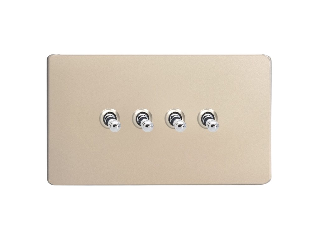 Páčkový vypínač TOGGLE - 4-modulový schodišťový (č.6); jednosměrný (č.1) 10A 1-pólový BEZŠROUBKOVÉ - satén / chromové páčky