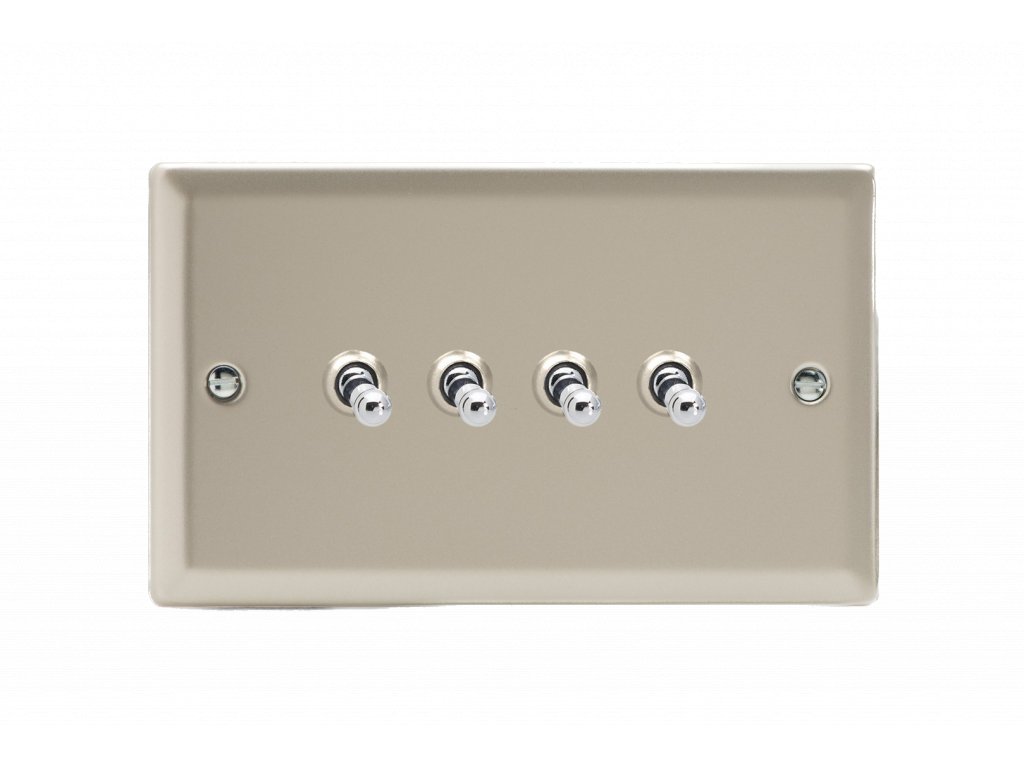 Páčkový vypínač TOGGLE - 4-modulový schodišťový (č.6); jednosměrný (č.1) 10A 1-pólový KLASICKÉ - satén / chromové páčky