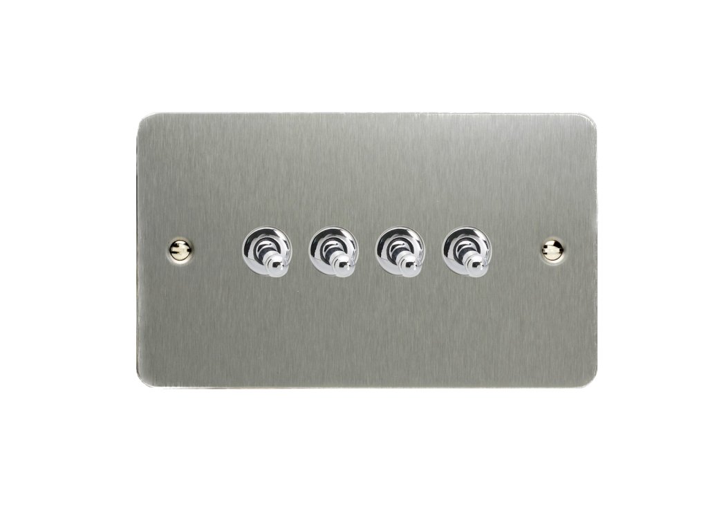 Páčkový vypínač TOGGLE - 4-modulový schodišťový (č.6); jednosměrný (č.1) 10A 1-pólový ULTRAPLOCHÉ - kartáčovaná ocel / chromové páčky