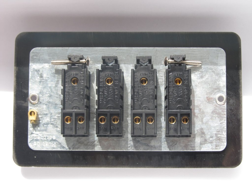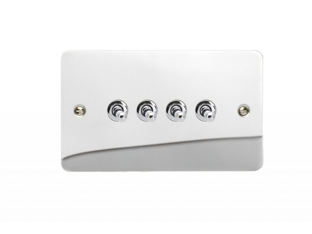 Páčkový vypínač TOGGLE - 4-modulový schodišťový (č.6); jednosměrný (č.1) 10A 1-pólový ULTRAPLOCHÉ - leštěný chrom / chromové páčky