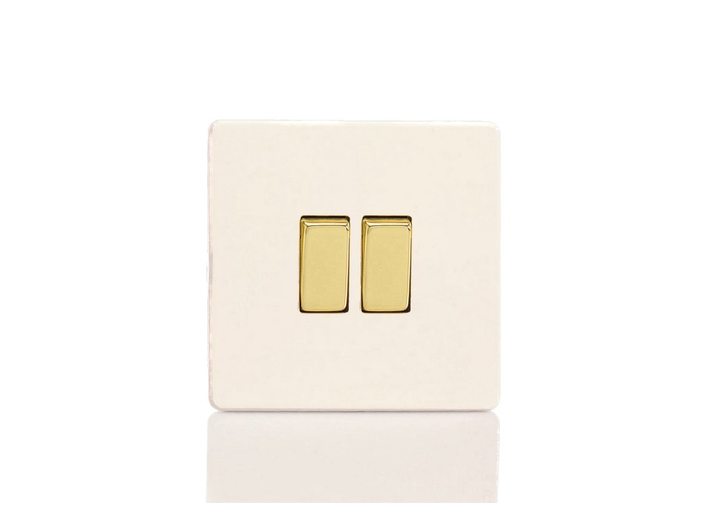 Kolébkový vypínač ROCKER - 2-modulový schodišťový (č.6); jednosměrný (č.1) 10A 1-pólový BEZŠROUBKOVÉ - matně bílá / mosazné kolébky