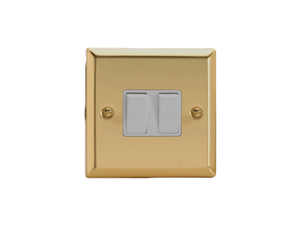 Kolébkový vypínač ROCKER - 2-modulový schodišťový (č.6); jednosměrný (č.1) 10A 1-pólový KLASICKÉ - leštěná mosaz / bílé kolébky