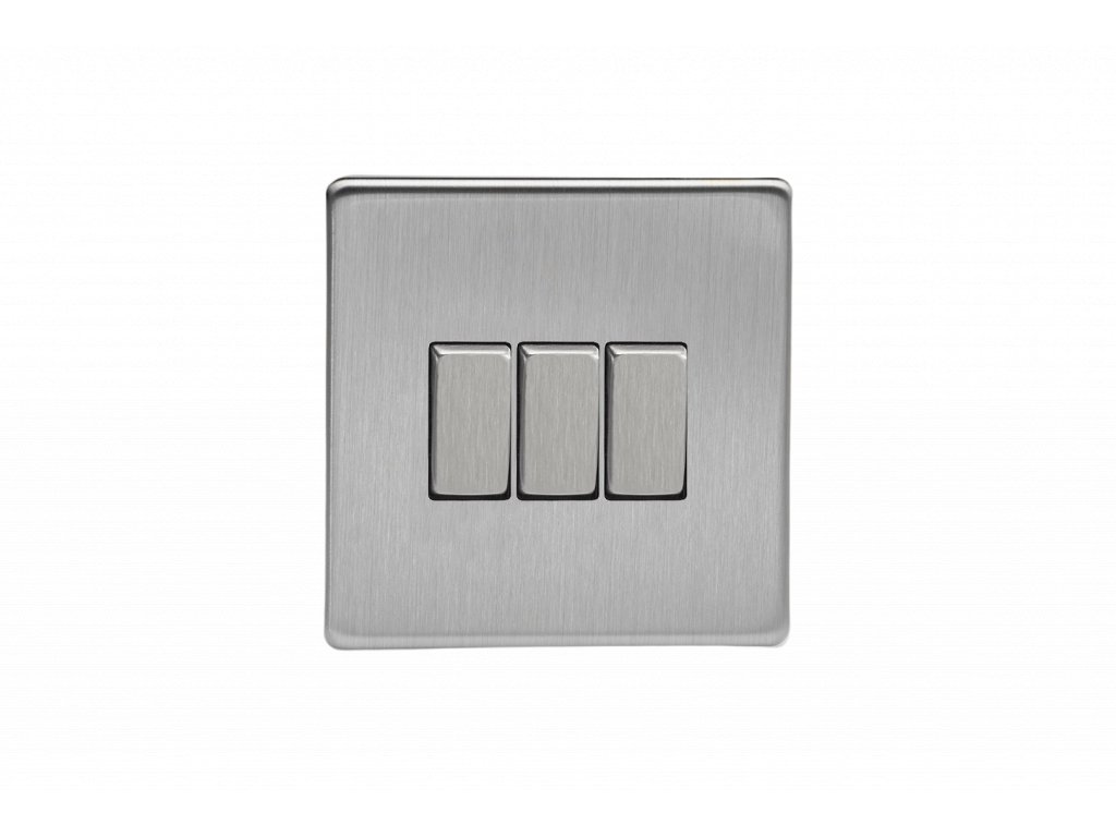 Kolébkový vypínač ROCKER - 3-modulový schodišťový (č.6); jednosměrný (č.1) 10A 1-pólový BEZŠROUBKOVÉ - kartáčovaná ocel / ocelové kolébky