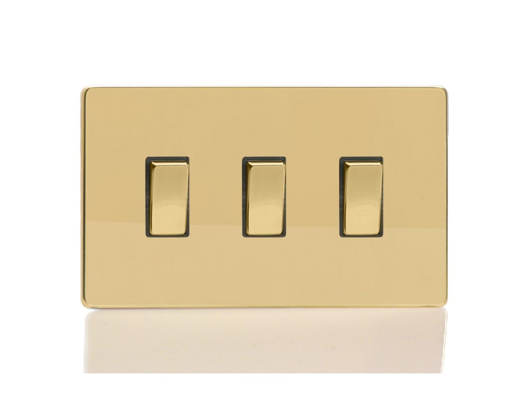 Kolébkový vypínač ROCKER - 3-modulový schodišťový (č.6); jednosměrný (č.1) 10A 1-pólový BEZŠROUBKOVÉ - leštěná mosaz / mosazné kolébky