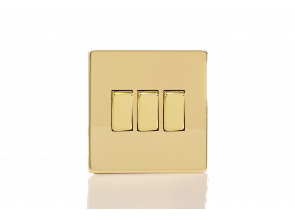 Kolébkový vypínač ROCKER - 3-modulový schodišťový (č.6); jednosměrný (č.1) 10A 1-pólový BEZŠROUBKOVÉ - leštěná mosaz / mosazné kolébky