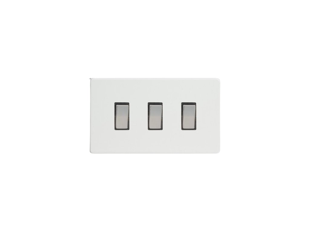 Kolébkový vypínač ROCKER - 3-modulový schodišťový (č.6); jednosměrný (č.1) 10A 1-pólový BEZŠROUBKOVÉ - prémiová bílá / chromové kolébky