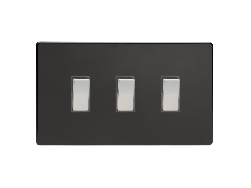 Kolébkový vypínač ROCKER - 3-modulový schodišťový (č.6); jednosměrný (č.1) 10A 1-pólový BEZŠROUBKOVÉ - prémiová černá / chromové kolébky