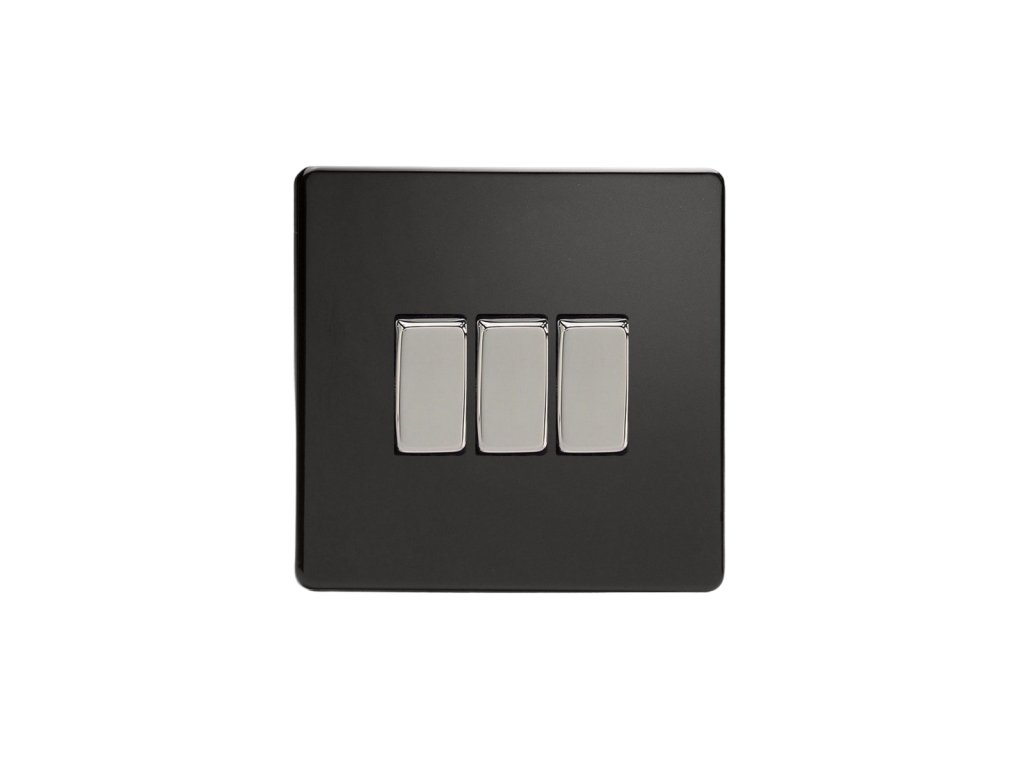 Kolébkový vypínač ROCKER - 3-modulový schodišťový (č.6); jednosměrný (č.1) 10A 1-pólový BEZŠROUBKOVÉ - prémiová černá / chromové kolébky