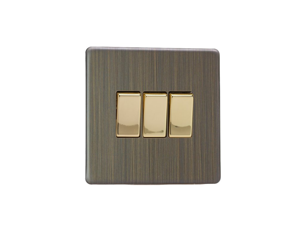 Kolébkový vypínač ROCKER - 3-modulový schodišťový (č.6); jednosměrný (č.1) 10A 1-pólový BEZŠROUBKOVÉ - starožitná mosaz / mosaz