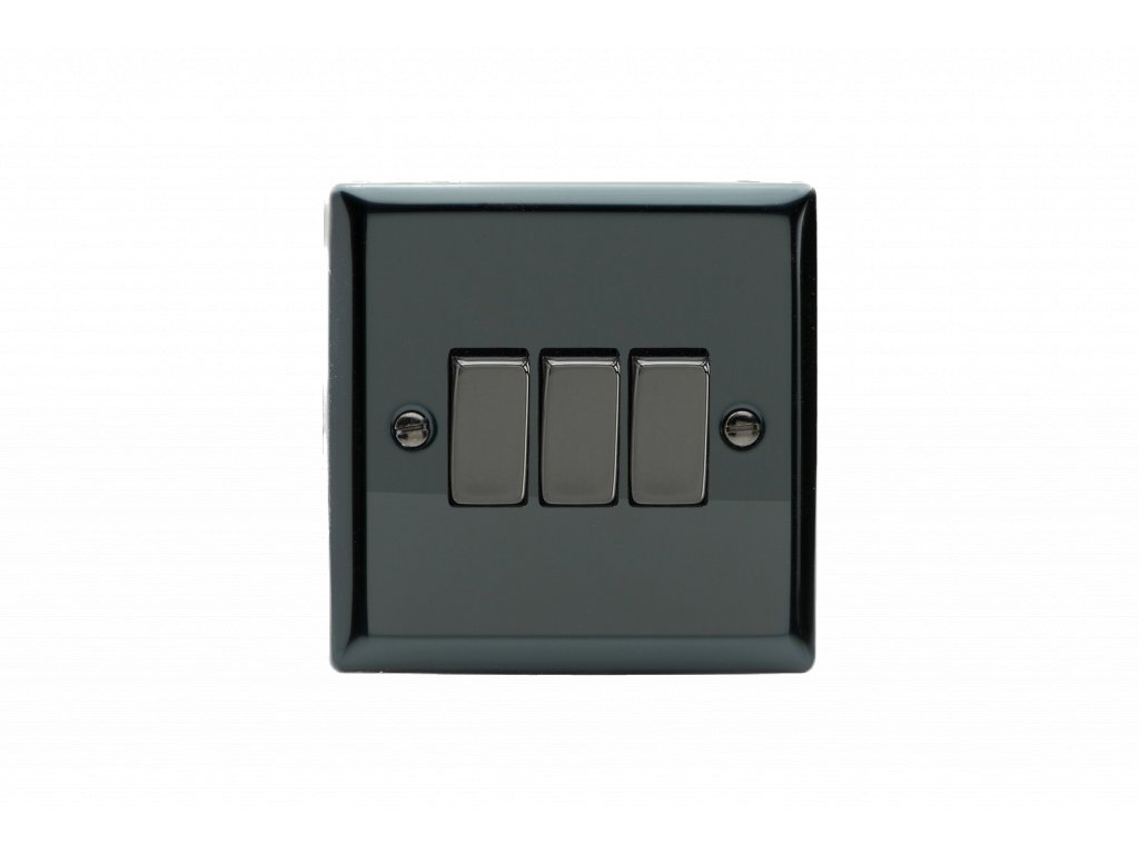 Kolébkový vypínač ROCKER - 3-modulový schodišťový (č.6); jednosměrný (č.1) 10A 1-pólový KLASICKÉ - černé (lesklé) iridium / černé (lesklé) iridium