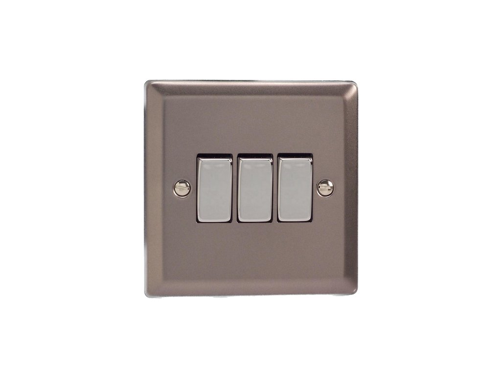 Kolébkový vypínač ROCKER - 3-modulový schodišťový (č.6); jednosměrný (č.1) 10A 1-pólový KLASICKÉ - cínová / chromové kolébky