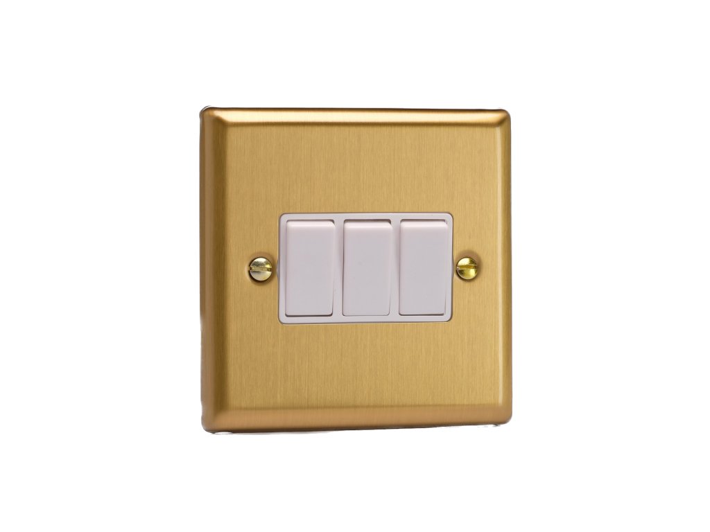 Kolébkový vypínač ROCKER - 3-modulový schodišťový (č.6); jednosměrný (č.1) 10A 1-pólový KLASICKÉ - kartáčovaná mosaz / bílé kolébky