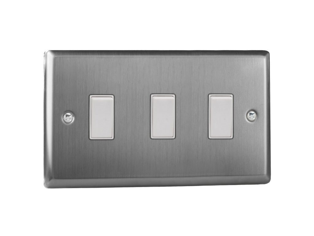 Kolébkový vypínaè ROCKER - 3-modulový schodiový (è.6); jednosmìrný (è.1) 10A 1-pólový KLASICKÉ - kartáèovaná ocel / bílé kolébky