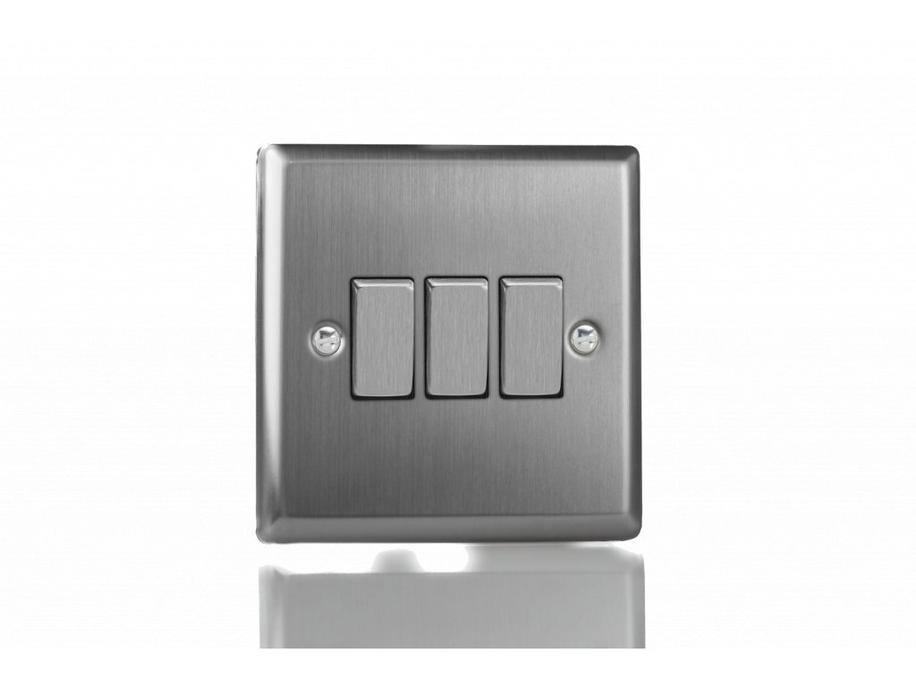 Kolébkový vypínač ROCKER - 3-modulový schodišťový (č.6); jednosměrný (č.1) 10A 1-pólový KLASICKÉ - kartáčovaná ocel / ocelové kolébky