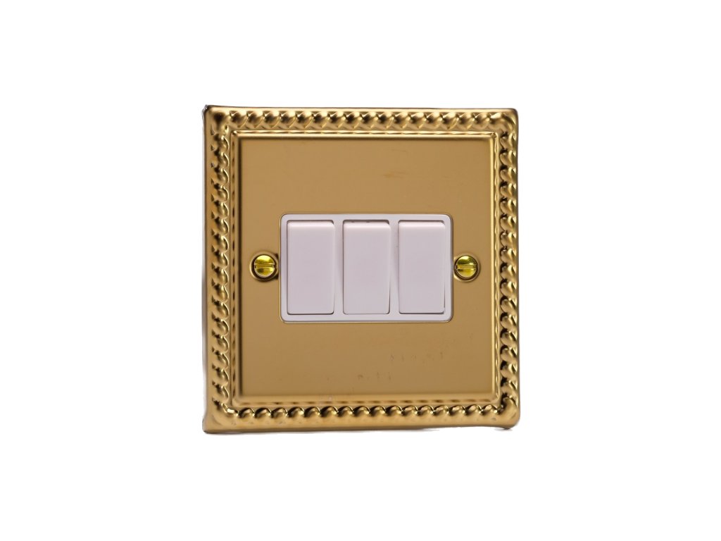 Kolébkový vypínač ROCKER - 3-modulový schodišťový (č.6); jednosměrný (č.1) 10A 1-pólový KLASICKÉ - leštěná mosaz / bílé kolébky