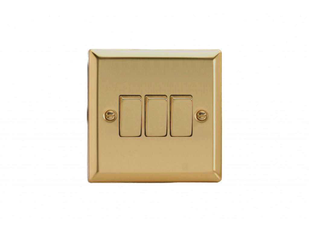 Kolébkový vypínač ROCKER - 3-modulový schodišťový (č.6); jednosměrný (č.1) 10A 1-pólový KLASICKÉ - leštěná mosaz / mosazné kolébky