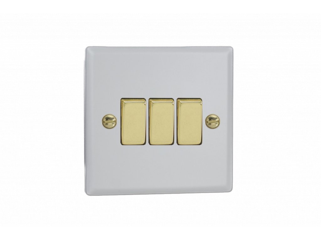 Kolébkový vypínač ROCKER - 3-modulový schodišťový (č.6); jednosměrný (č.1) 10A 1-pólový KLASICKÉ - matně bílá / leštěná mosaz