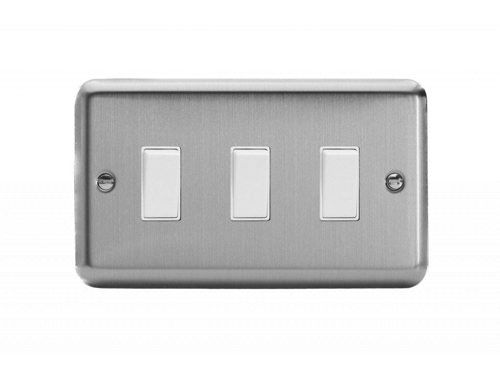 Kolébkový vypínač ROCKER - 3-modulový schodišťový (č.6); jednosměrný (č.1) 10A 1-pólový KLASICKÉ - matně chromová / bílé kolébky