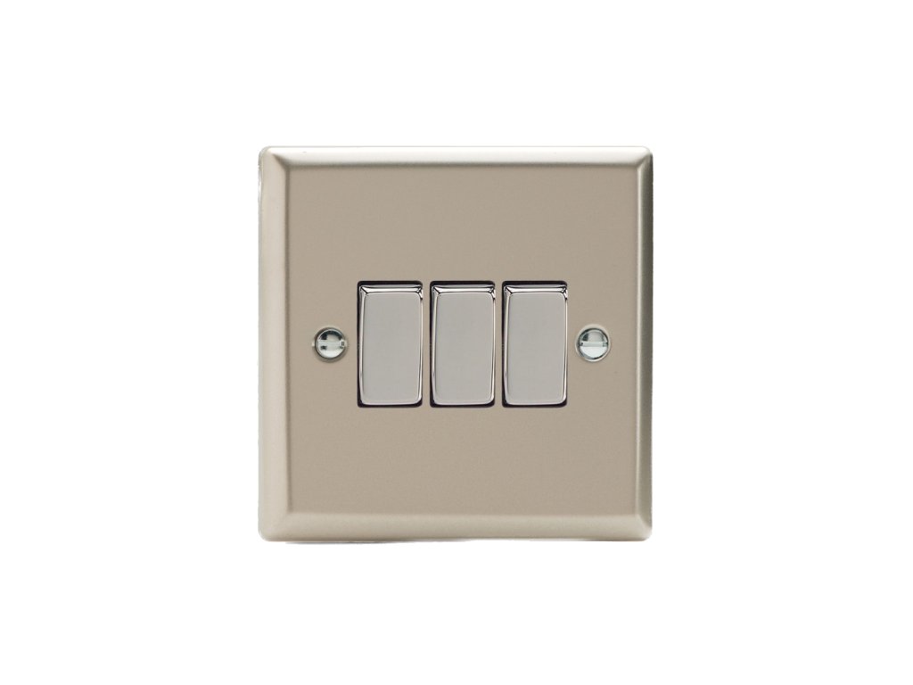 Kolébkový vypínač ROCKER - 3-modulový schodišťový (č.6); jednosměrný (č.1) 10A 1-pólový KLASICKÉ - satén / chromové kolébky