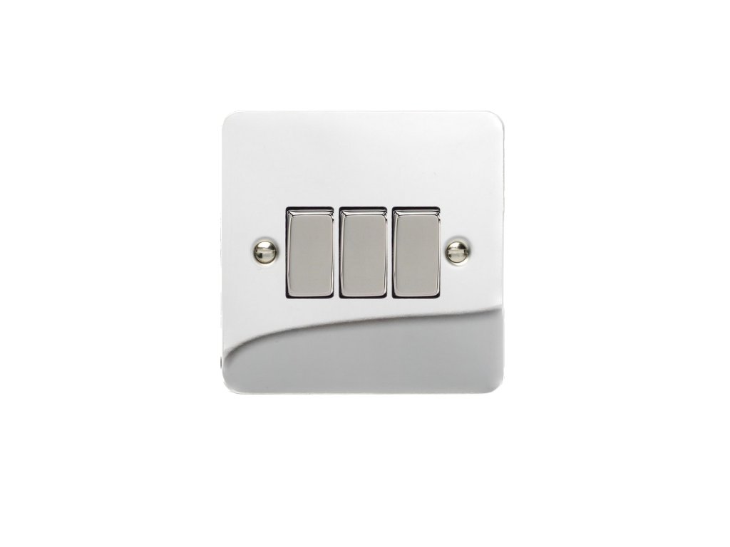 Kolébkový vypínač ROCKER - 3-modulový schodišťový (č.6); jednosměrný (č.1) 10A 1-pólový ULTRAPLOCHÉ - leštěný chrom / chromové kolébky