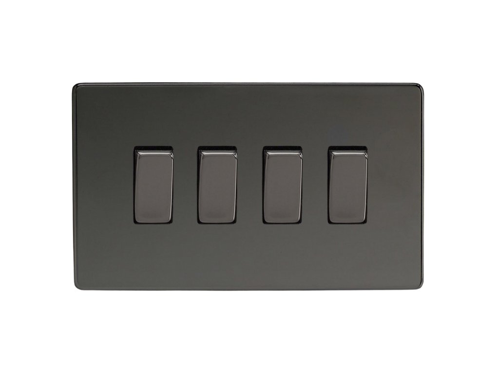 Kolébkový vypínač ROCKER - 4-modulový schodišťový (č.6); jednosměrný (č.1) 10A 1-pólový BEZŠROUBKOVÉ - černé (lesklé) iridium / černé (lesklé) iridium