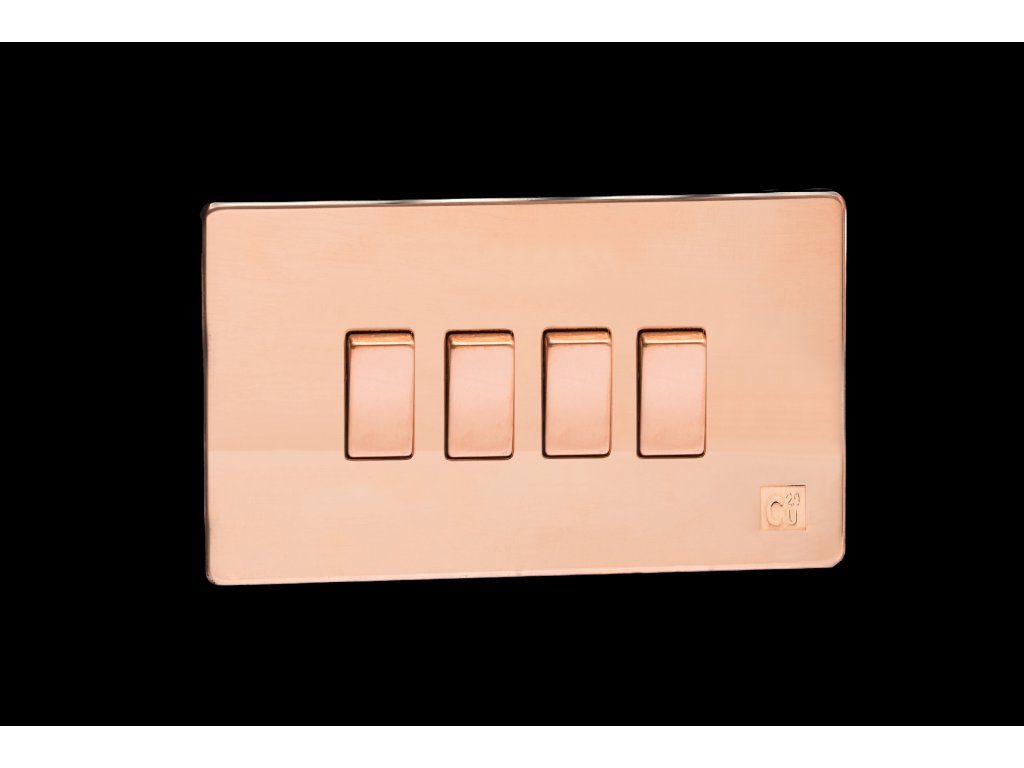 Kolébkový vypínač ROCKER - 4-modulový schodišťový (č.6); jednosměrný (č.1) 10A 1-pólový BEZŠROUBKOVÉ - cu29 surová měď / měděné kolébky